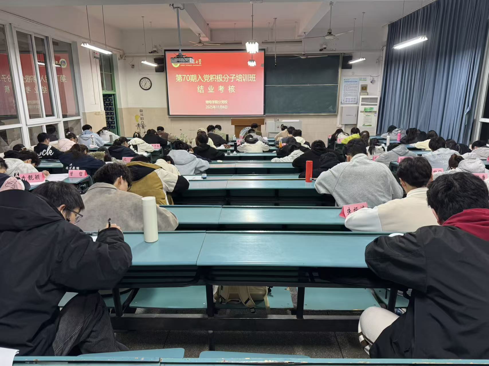 为检验本期培训班入党积极分子思想理论修养和培训学习成果,11月6日晚,培训班125名入党积极分子在花津校区教学楼4号楼2010102、103教室参加结业考试。在考试过程中,学员们严格遵守考试纪律,认真答题,态度端正,展现出良好的考试风气,用实际行动向组织交出了一份满意的答卷,以认真的态度表明了积极向党组织靠拢的决心。