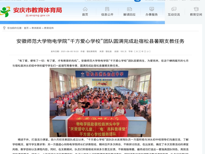 本网讯(千方爱心学校赴洲头初中支教团队)7月13日上午,安徽师范大学彩票app “千方爱心学校”赴宿松县洲头初中2021年暑期社会实践活动再起航。