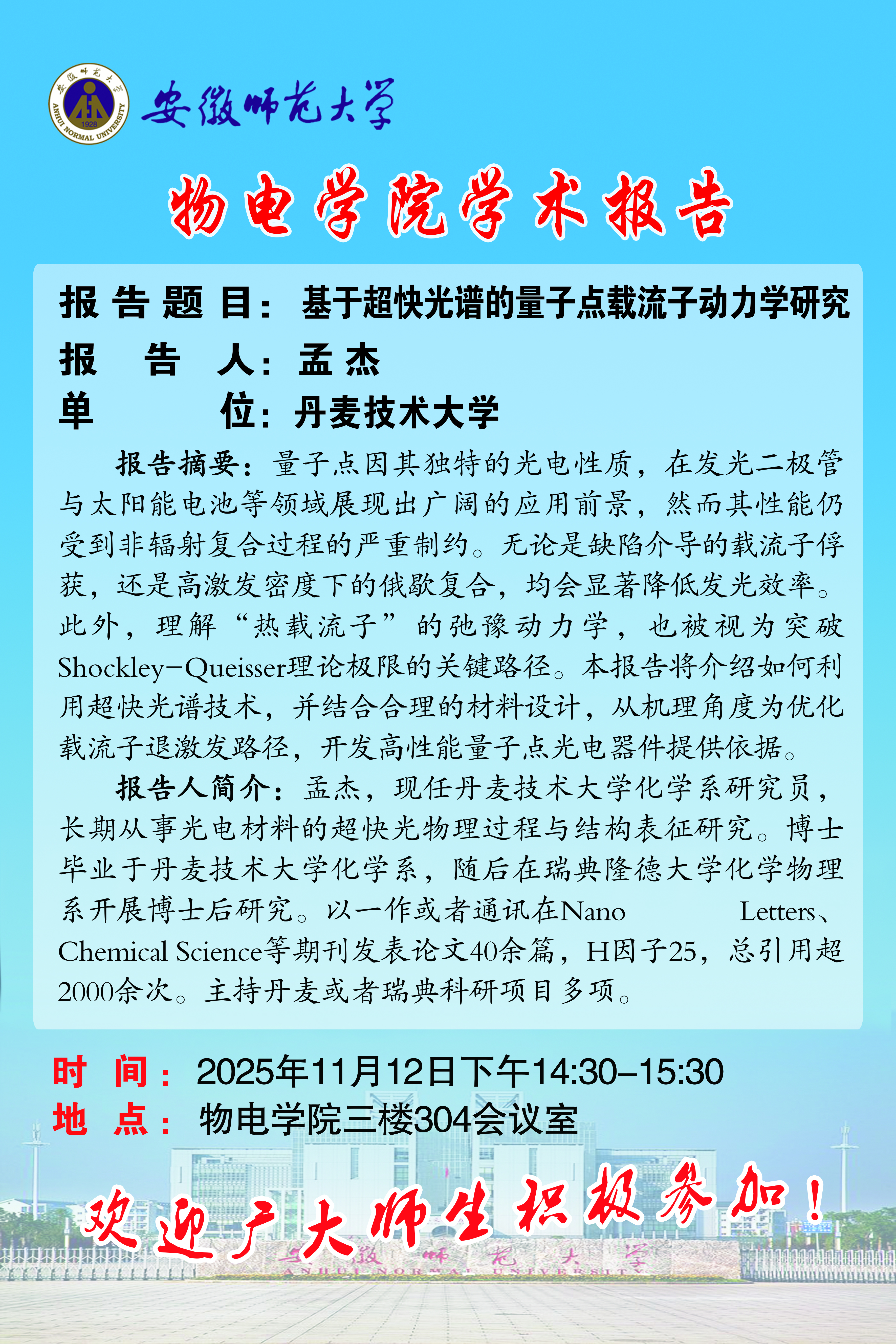 【学术预告】彩票讲坛 2025年第47期:基于超快光谱的量子点载流子动力学研究