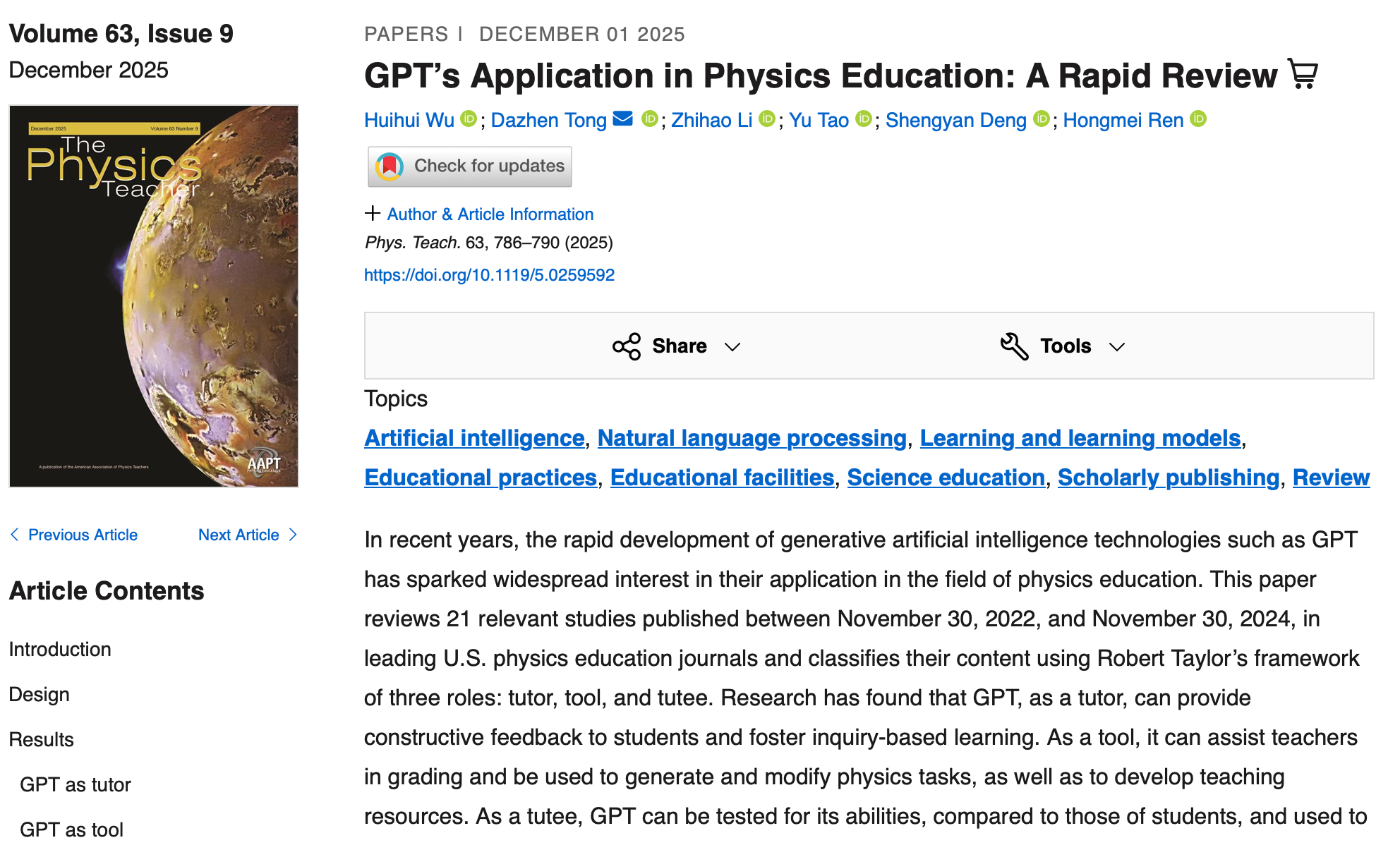 近年来,以ChatGPT为代表的生成式人工智能技术迅猛发展,其在教育领域的应用潜力引发广泛关注。然而,GPT在物理教育中的具体角色、功能与局限尚缺乏系统梳理。该研究围绕“GPT在物理教育中扮演何种角色”、“这些角色如何实现”以及“其应用面临哪些机遇与挑战”三个核心问题,对2022年11月至2024年11月间发表于美国三大物理教育期刊的21篇实证研究进行了系统综述,并基于Robert Taylor的“计算机教育三角色”框架(导师、工具、学生)对GPT的功能进行分类分析。