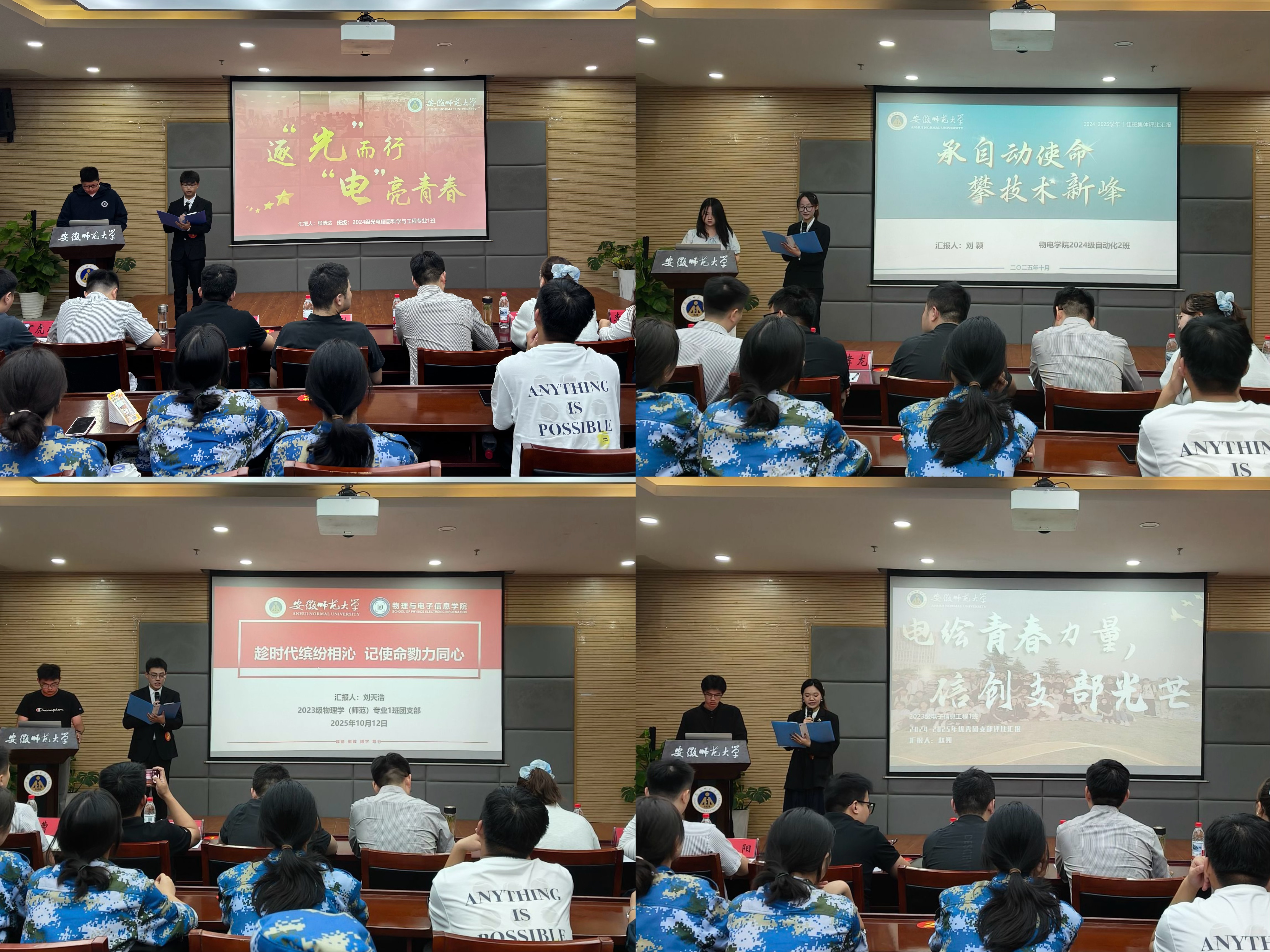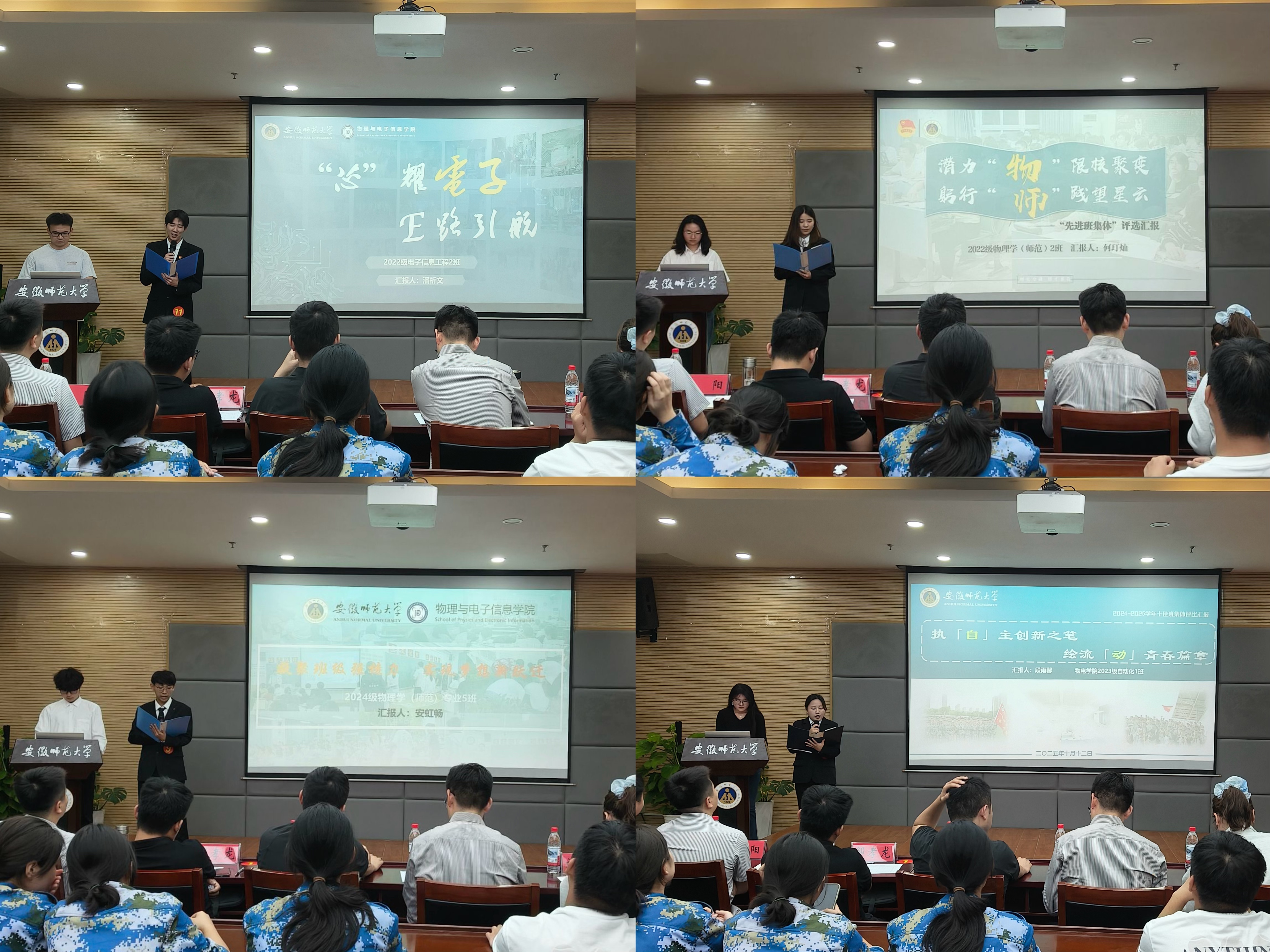 展评会上,12个班集体、团支部学生代表依次登台汇报,全面汇报了班级组织建设、思想引领、学风建设、基础文明等方面工作成效。2022级物理学(师范)2班以“潜力‘物’限核聚变,躬行‘师’践望星云”为题,讲述物理师范生在专业学习、教学技能打磨、学科竞赛参与中的成长轨迹;2023级光电信息科学与工程1班围绕“聚时代之‘光’,成时代之‘电’”的主题,以“理论筑基”“实验攻坚”“科创赋能”为脉络,展现光电学子在专业领域探索突破的奋进历程;2024级物理学(师范)5班则以“凝聚班级稳核力,实现梦想新跃迁”为题,阐述班级同学在班级文化建设、专业知识学习、教育理念践行中的成长足迹。各参评集体立足学校大学生护航行动计划采取的创新举措、取得的良好成果得到了评委老师和学生代表的肯定,赢得了阵阵掌声。