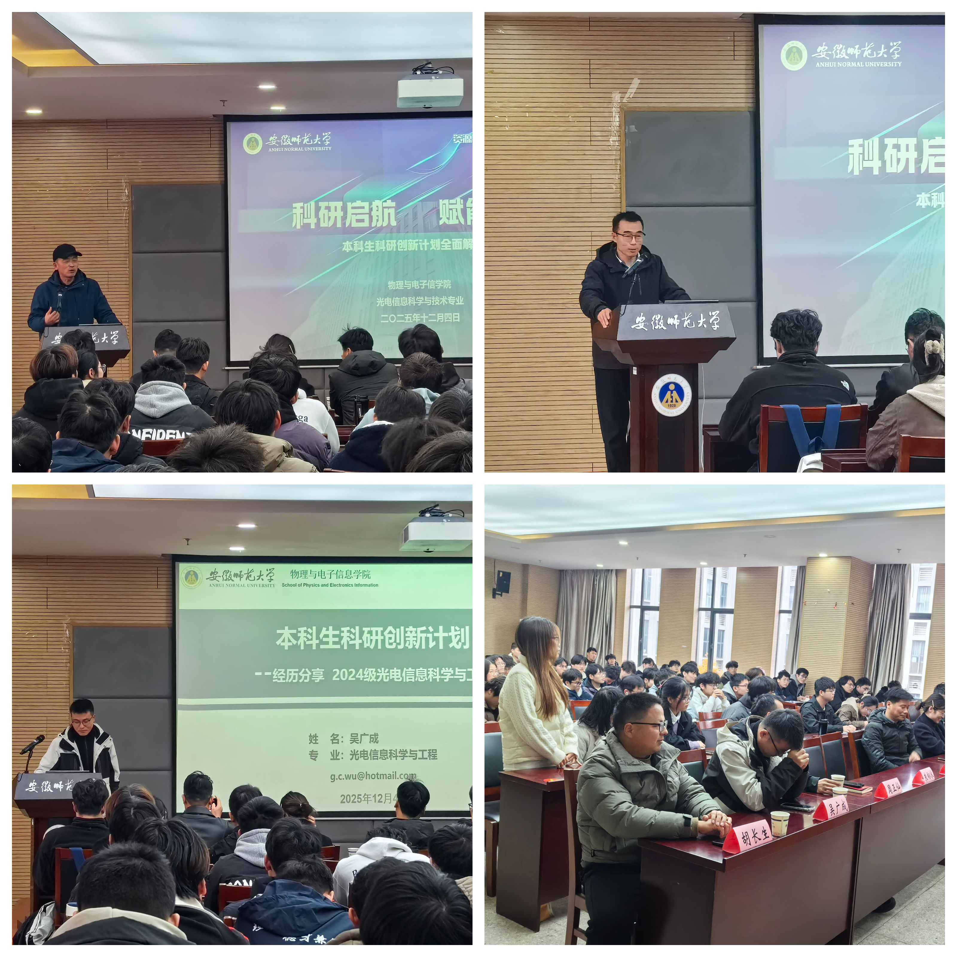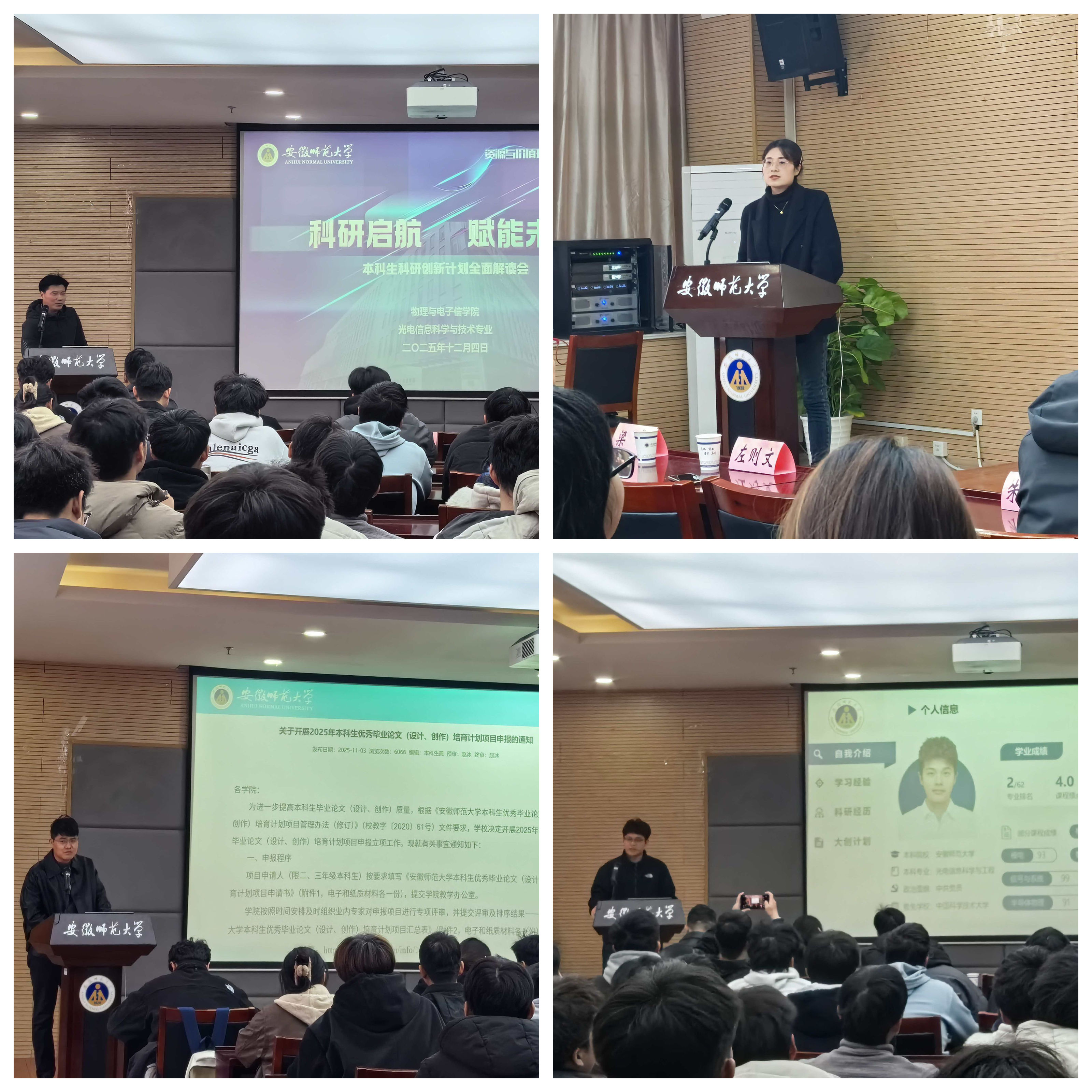 为帮助2024级光电信息科学与工程专业学生厘清学术与职业发展方向,提前规划科研创新路径,12月14日下午,“科研启航,赋能未来”本科生科研创新计划全面解读会在物理楼304会议室举办。学院副院长张爱清,光电专业负责人左则文,光电专业教师朱向冰、周正仙、梁莉、吴广成,班主任吴贵渊、胡长生,2022级光电专业学生吴禹森受邀参加,辅导员张津源主持活动。